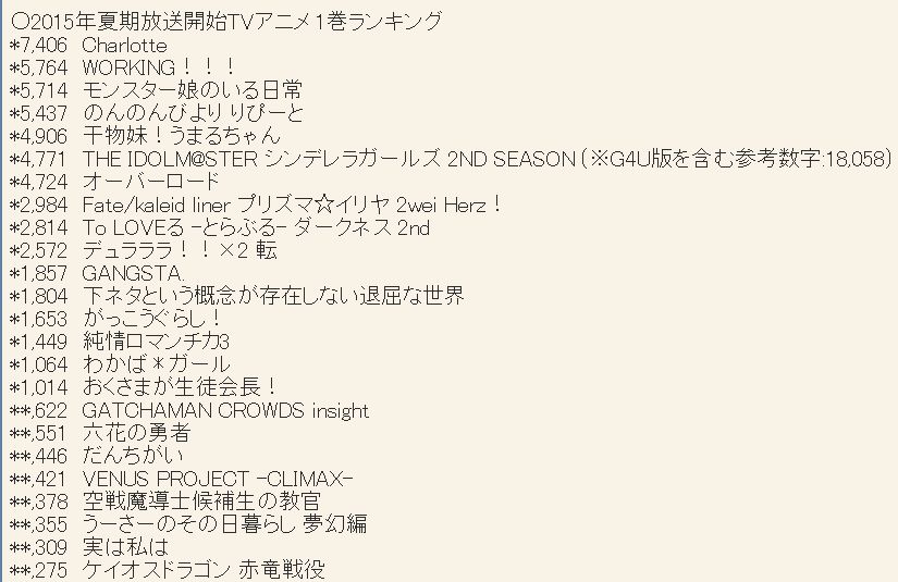 2015년 7월 신작 애니메이션 제 1권 판매량 랭킹 업데이트