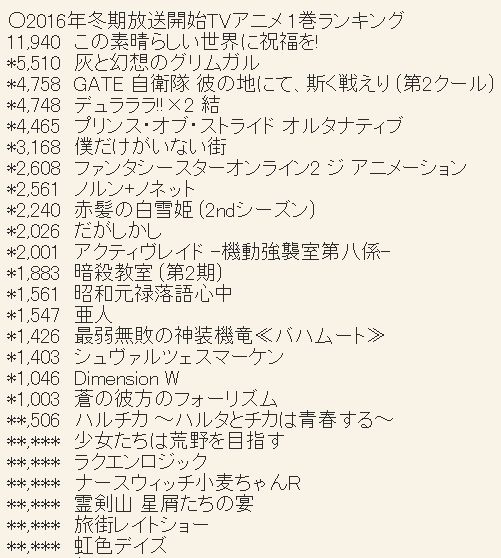 2016년 1월 신작 애니메이션 제 1권 판매량 랭킹 업데이트