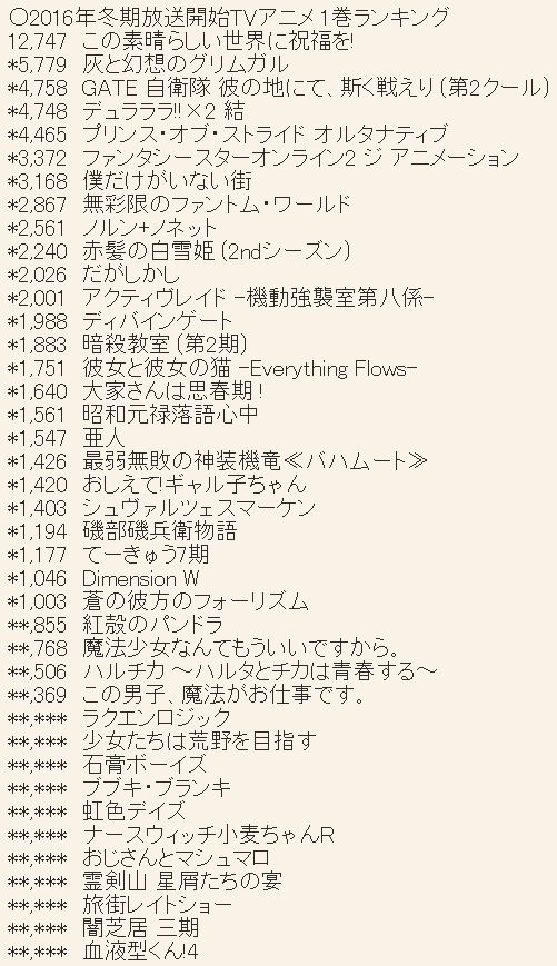 ※ 2016년 겨울(1월) 방송 개시 TV 애니메이션 블루레이 & DVD 제 1권 판매량 랭킹