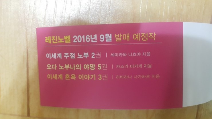 전동감귤 레진노벨 9월 발행 예정작 [도서] 작성일시 : 2016. 08. 10 (20:30) 조회 : 2,344 / 댓글 : 0 이세계 주점 노부 2권 이세계 혼욕 이야기 3권 오다 노부나의 야망 5권 출처(링크) : http://cafe.naver.com/jnovel21/113006 1추천 글쓰기스크랩 신고