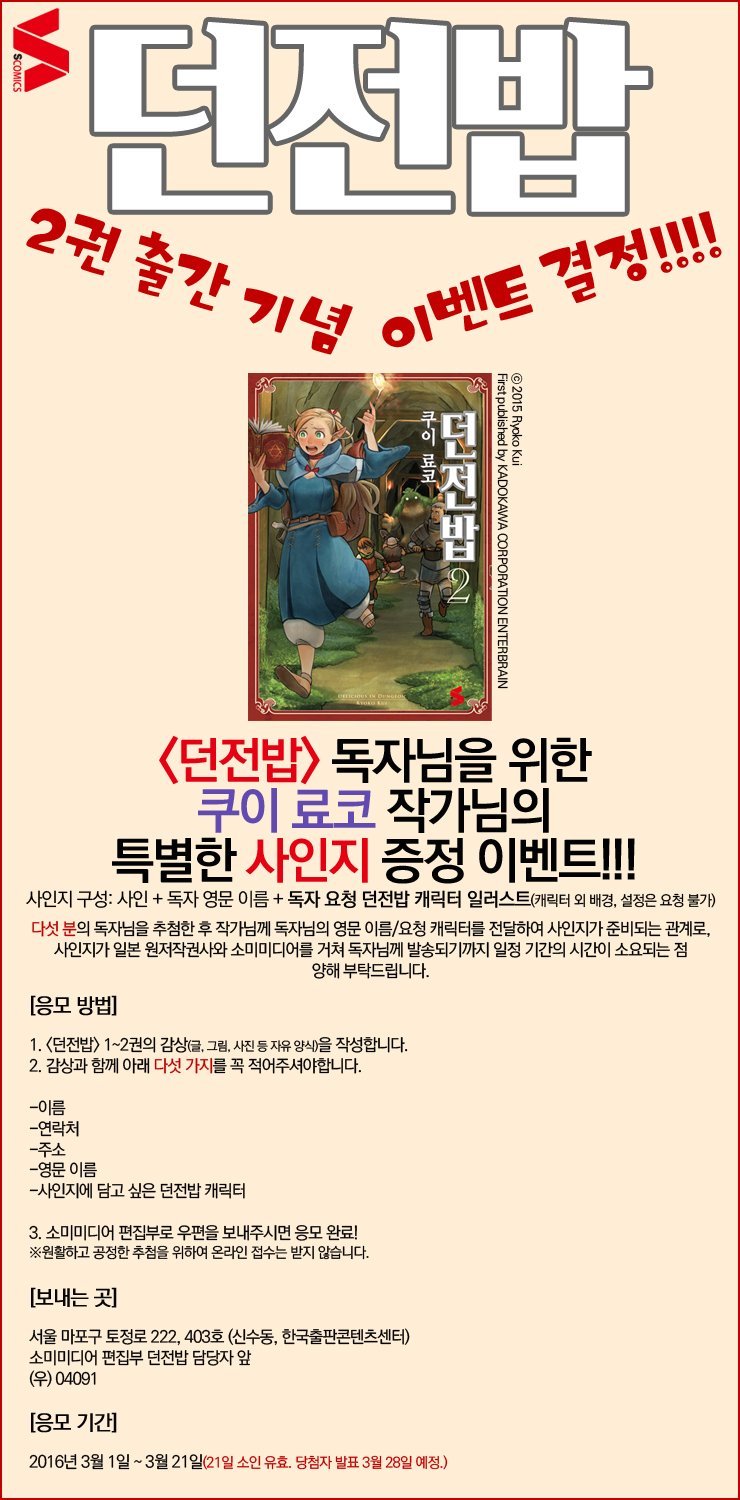 Teixeira [던전밥] 2권 출간기념 이벤트 결정 [도서] 작성일시 : 2016. 02. 29 (11:26) 조회 : 2,888 / 댓글 : 0 출처(링크) : https://twitter.com/SomyMedia/status/704127136462864384 0추천 글쓰기스크랩 신고