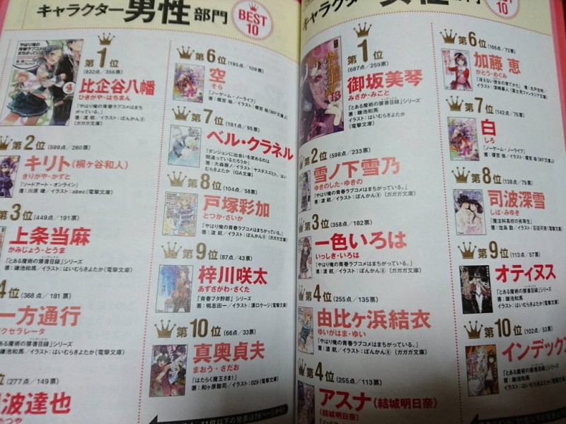 매해 연말마다 발행되는 라이트노벨 가이드 & 랭킹 도서 [ 이 라이트노벨이 대단해! 2016 ] 의 남성 & 여성의 인기 캐릭터 랭킹이 공개 되었다고 합니다. 본 서적은 11월 21일 명일에 발매되었다고 하며, 오프라인 매장 선행발매에 따른