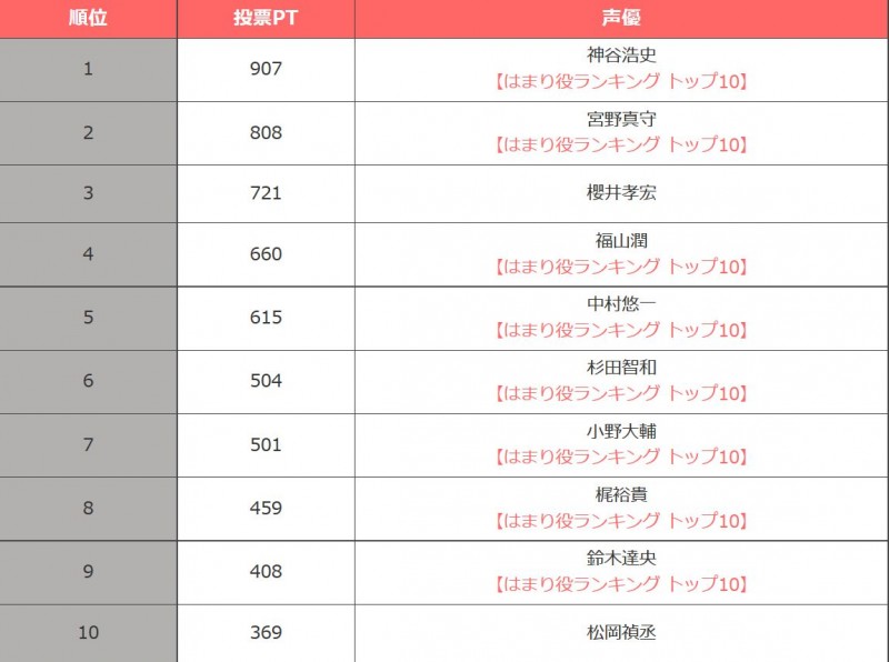 인기 여성 성우 랭킹에 이어, 인기 남성 성우 랭킹 2016 앙케이트 결과도 공개