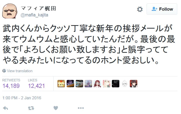 성우 타케우치 슌스케, 신년 인사 메일 마지막의 오타 때문에 '야루오' 같다는 얘기를