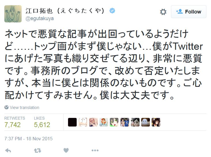 성우 에구치 타쿠야, 현재 논란이 되는 사진은 자신과 무관한 합성 사진이라고 주장