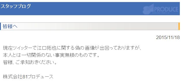 소속 사무소인 81 프로듀스의 스탭 블로그에도 '에구치 타쿠야 본인과는 일절