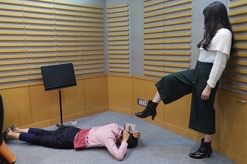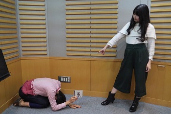 송 진행을 맡은 요시다 히사노리 아나운서가 바닥에 엎드려 있고, 그 앞에서 아마