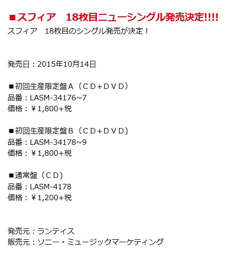 성우 유닛 스피어의 18번째 싱글 음반이 2015년 10월 14일에 발매될 예정이라고
