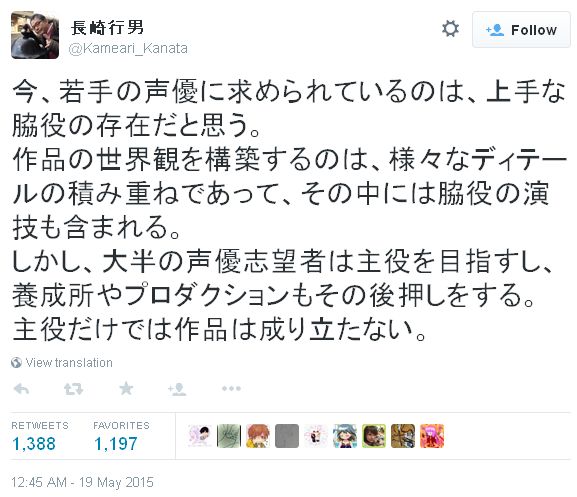 애니메이션 음향감독 '나가사키 유키오'씨가 자신의 트위터에 올린 글을 통해,