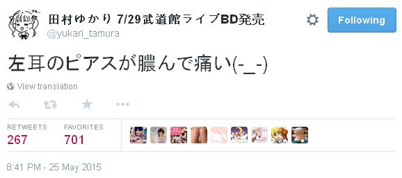 성우 타무라 유카리씨가 왼쪽 귀의 귀걸이 구멍이 곪아서 아프다는 내용의 트윗을