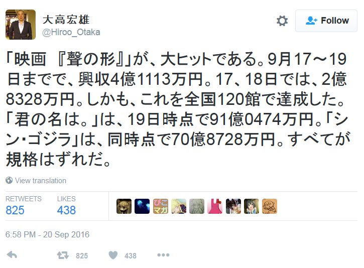 애니메이션 '목소리의 형태'가 대히트라고 평했더군요. 2016년 9월 17일부터