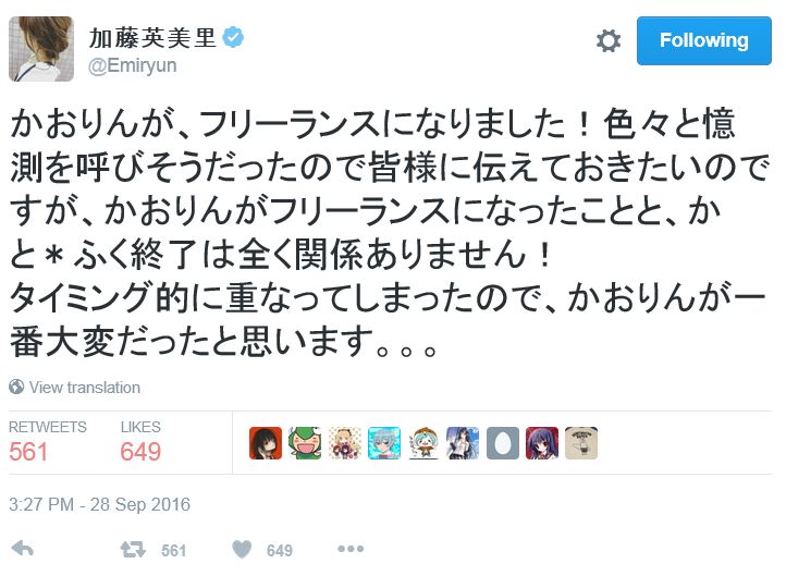 성우 카토 에미리씨가 자신의 트위터에 올린 글을 통해, 성우 후쿠하라 카오리