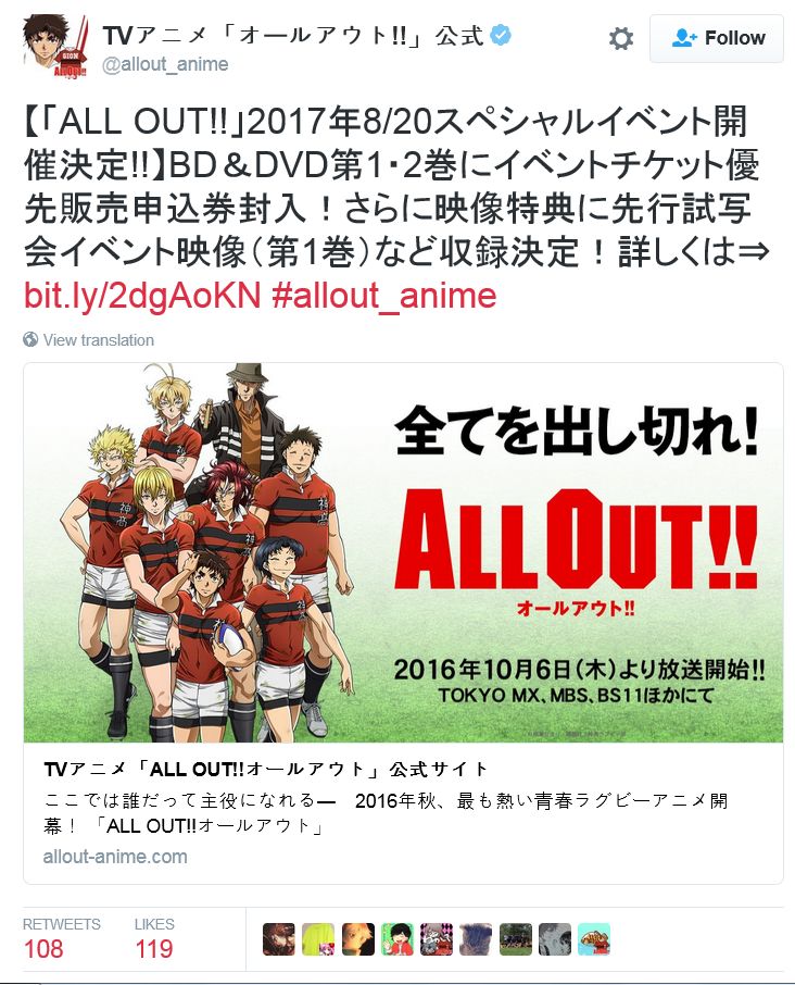 TV 애니메이션 'ALL OUT!!' 스페셜 이벤트, 2017년 8월 20일 개최 예정