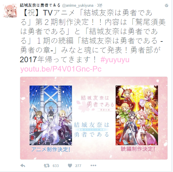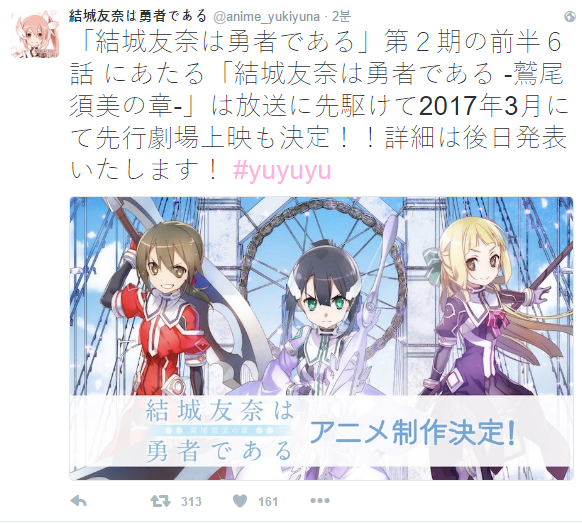 유우키 유우나는 용사다 속편 결정,와시오 스미는 용사다 애니화 결정