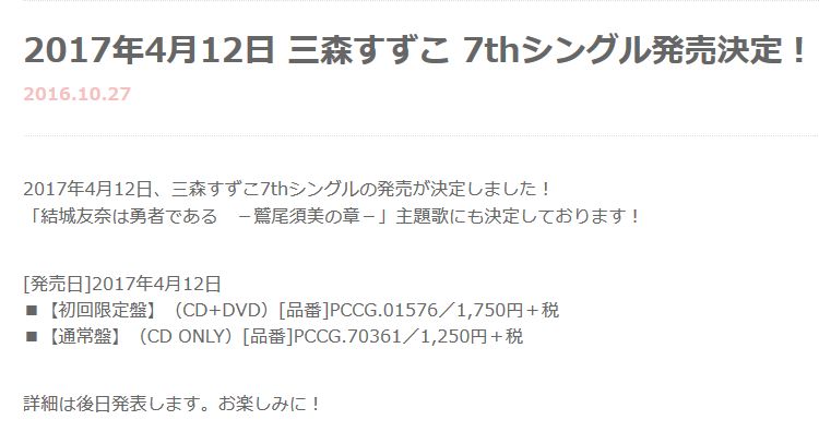 성우 미모리 스즈코씨의 7번째 싱글 음반, 2017년 4월 12일 발매 예정