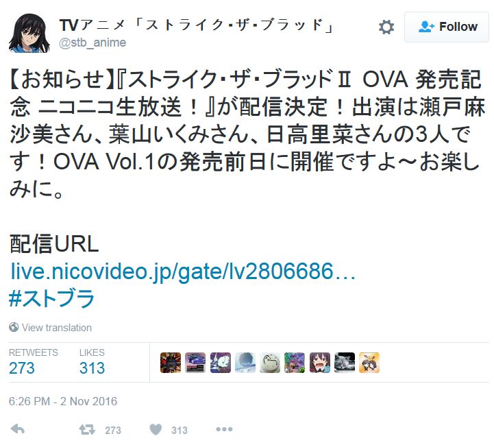 스트라이크 더 블러드 II OVA 발매 기념 니코니코 생방송 결정