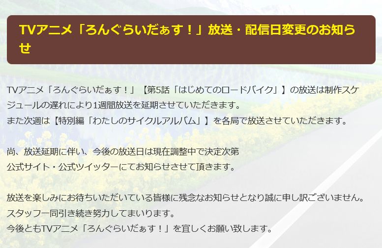 TV 애니메이션 '롱라이더즈!' 공식 홈페이지에 올라온 공지에 따르면, 제 5화