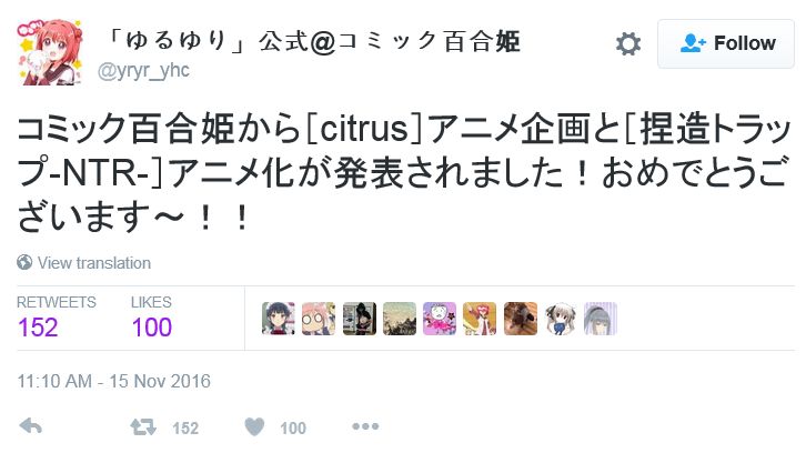 백합 만화 '날조 트랩' 애니메이션화 결정, 'citrus' 애니메이션화 진행중