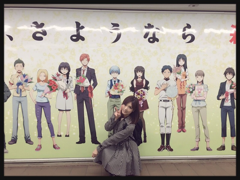 성우 후치가미 마이씨의 사진, 암살교실 초대형 포스터를 배경으로