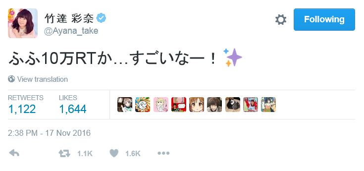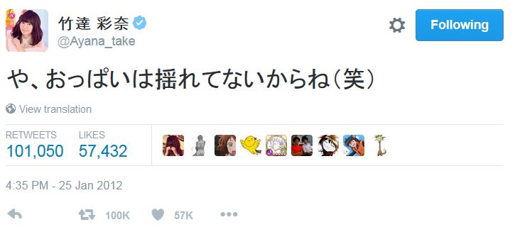 성우 타케타츠 아야나, 2012년의 트윗 하나가 10만 리트윗 돌파