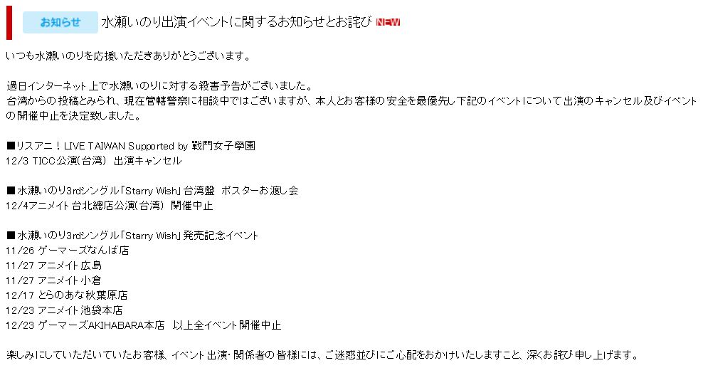 성우 미나세 이노리에 대한 살해 예고가 인터넷에 투고, 이벤트 전부 중지 결정.