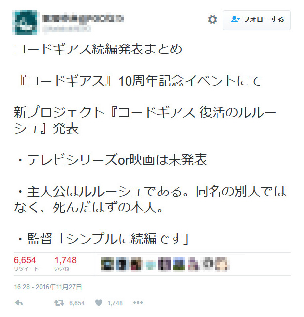 2016년 11월 27일에 개최된 '코드기어스' 10주년 기념 이벤트에서, 신작