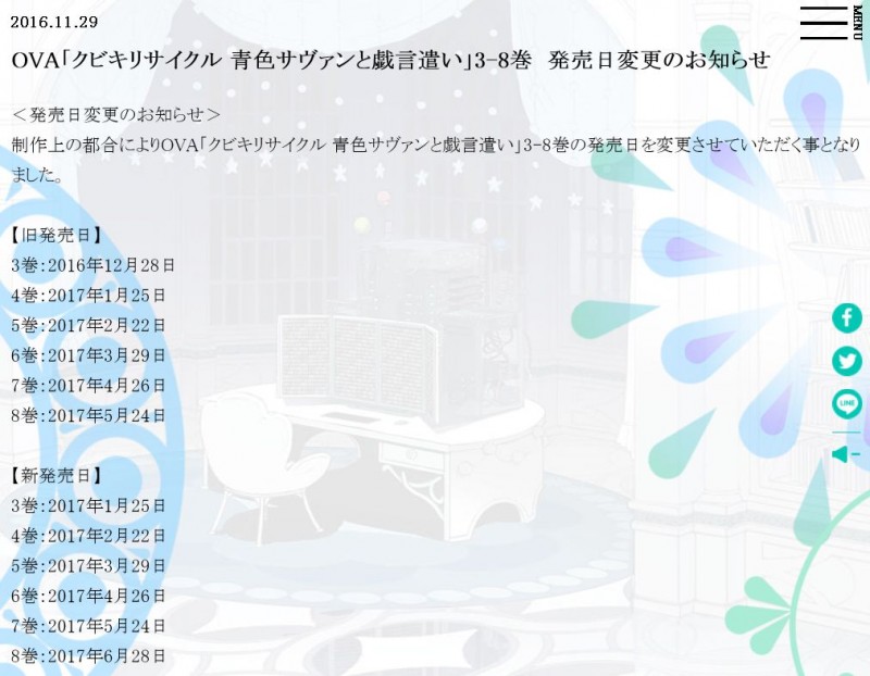 OVA '잘린머리 사이클' 제 3권 - 제 8권의 발매 연기 소식