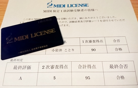 성우 코이와이 코토리가 자신의 블로그에 올린 사진입니다. MIDI 검정 1급
