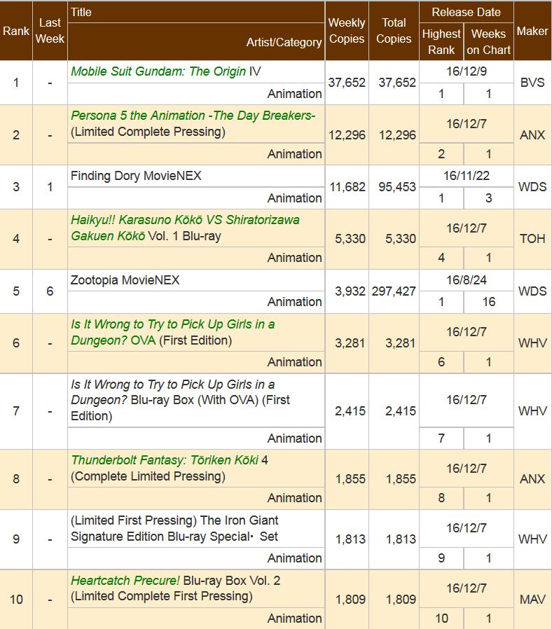 2016년 12월 5일 - 11일, 애니메이션 블루레이 & DVD 판매량 자료