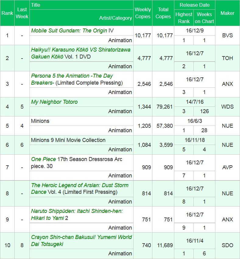 2016년 12월 5일 - 11일 기간 동안 집계된, 일본의 애니메이션 블루레이 & DVD