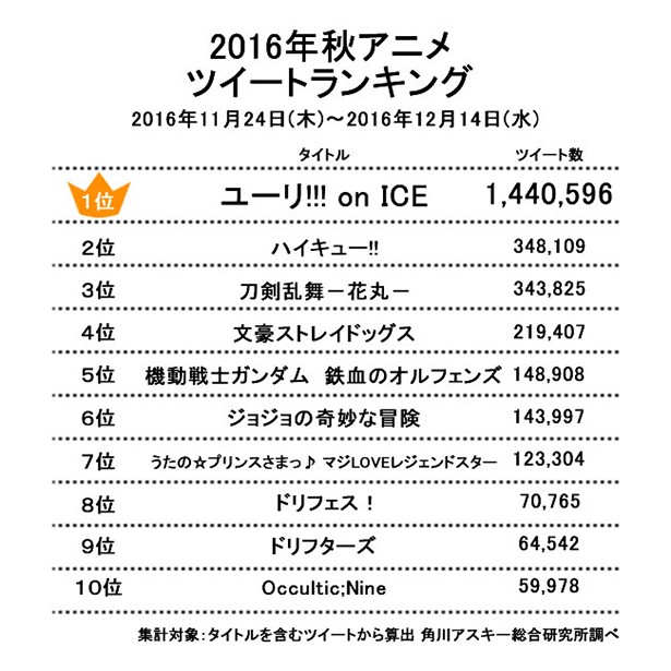 * 2016년 가을 애니메이션 트윗 랭킹 (2016년 11월 24일 - 12월 14일 집계)