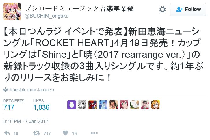 성우 닛타 에미씨의 새로운 싱글 음반 'ROCKET HEART'가 2017년 4월 19일