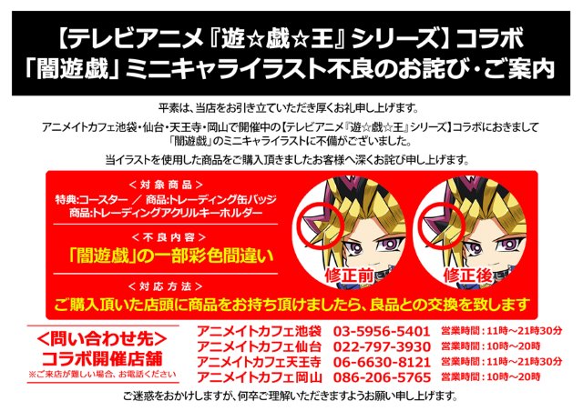 일본 애니메이트 카페, 유희왕 콜라보레이션 카페 행사 특전에 실수가 있었다고 교환 발표