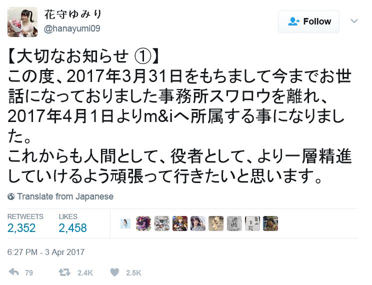 성우 하나모리 유미리가 2017년 4월 1일에 사무소를 옮겼답니다.