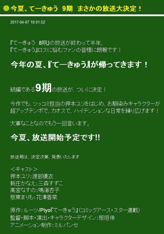 테큐 애니메이션 제 9기, 올 여름에 방송될 예정이랍니다.