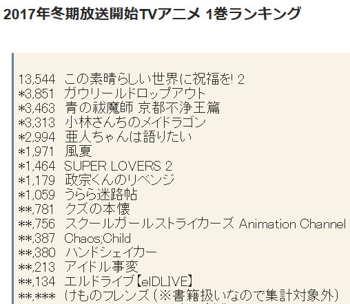 2017년 1월 신작 TV 애니메이션 제 1권 판매량 랭킹
