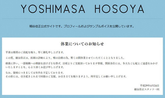 성우 호소야 요시마사씨가 2017년 4월 24일, 의사의 진단에 따라, 목을 치료