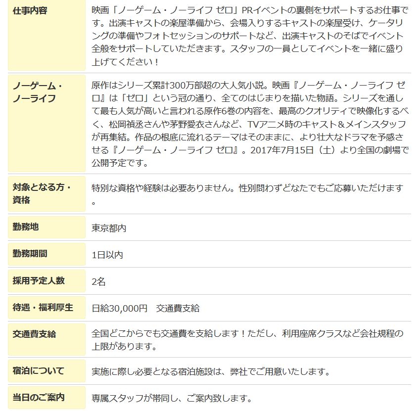 극장판 '노 게임 노 라이프 제로' PR 이벤트 서포트 아르바이트 구인 광고