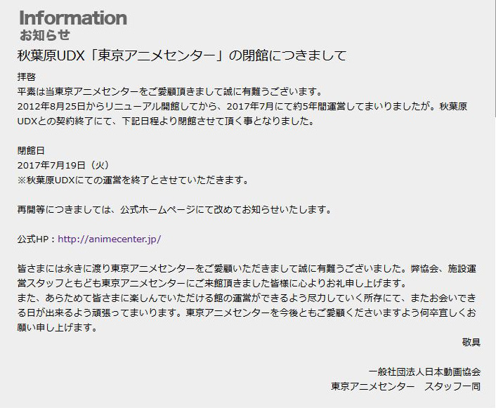 아키하바라 UDX '도쿄 애니메이션 센터'가 2017년 7월 19일에 폐관