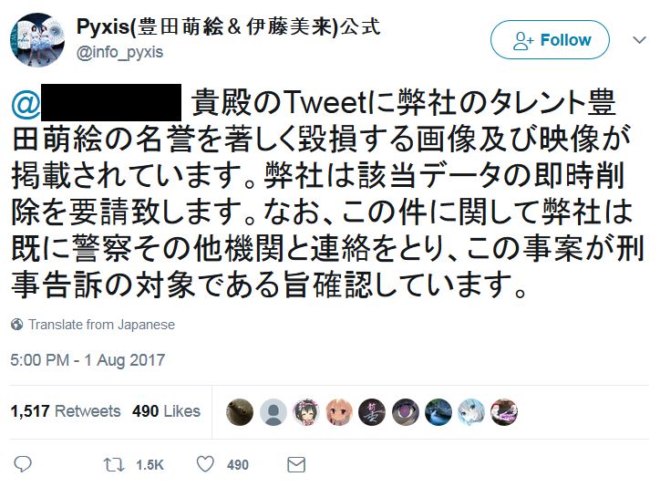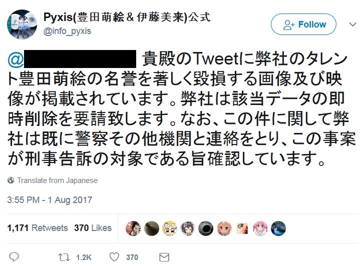 성우 토요타 모에의 소속사가 일본의 일부 트위터 유저에게 경고 메시지