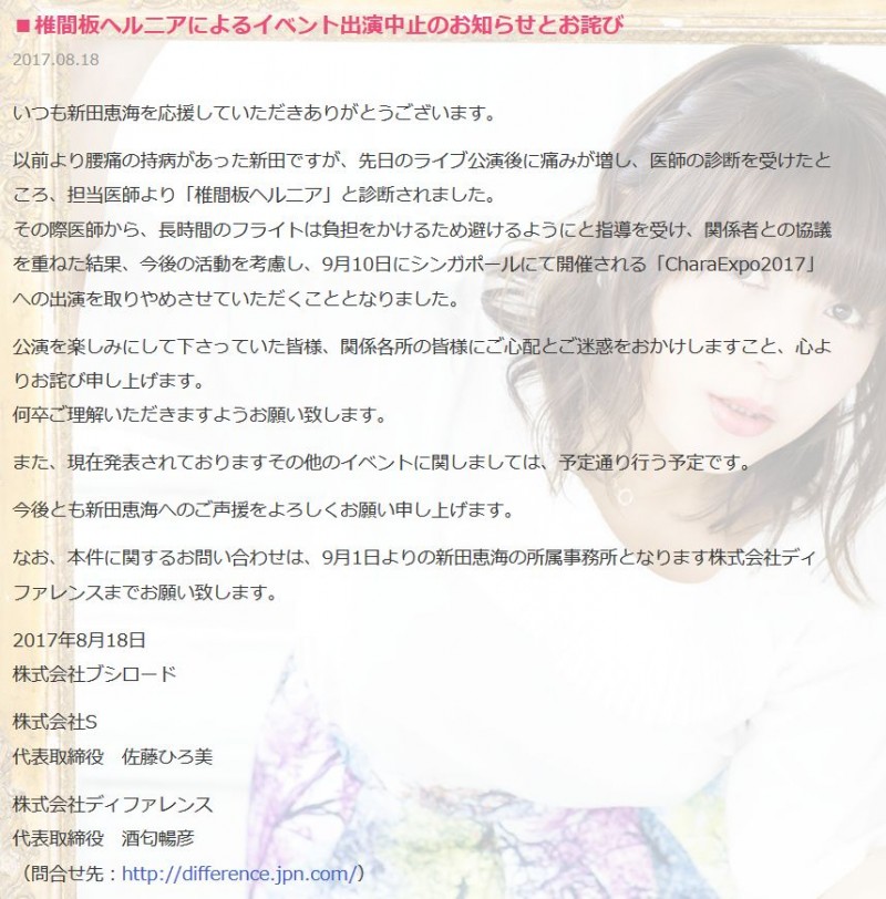 성우 닛타 에미, 추간판 탈출증으로 'CharaExpo 2017' 이벤트 출연 포기