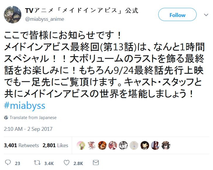 TV 애니메이션 '메이드 인 어비스' 최종회는 1시간 스페셜이랍니다.