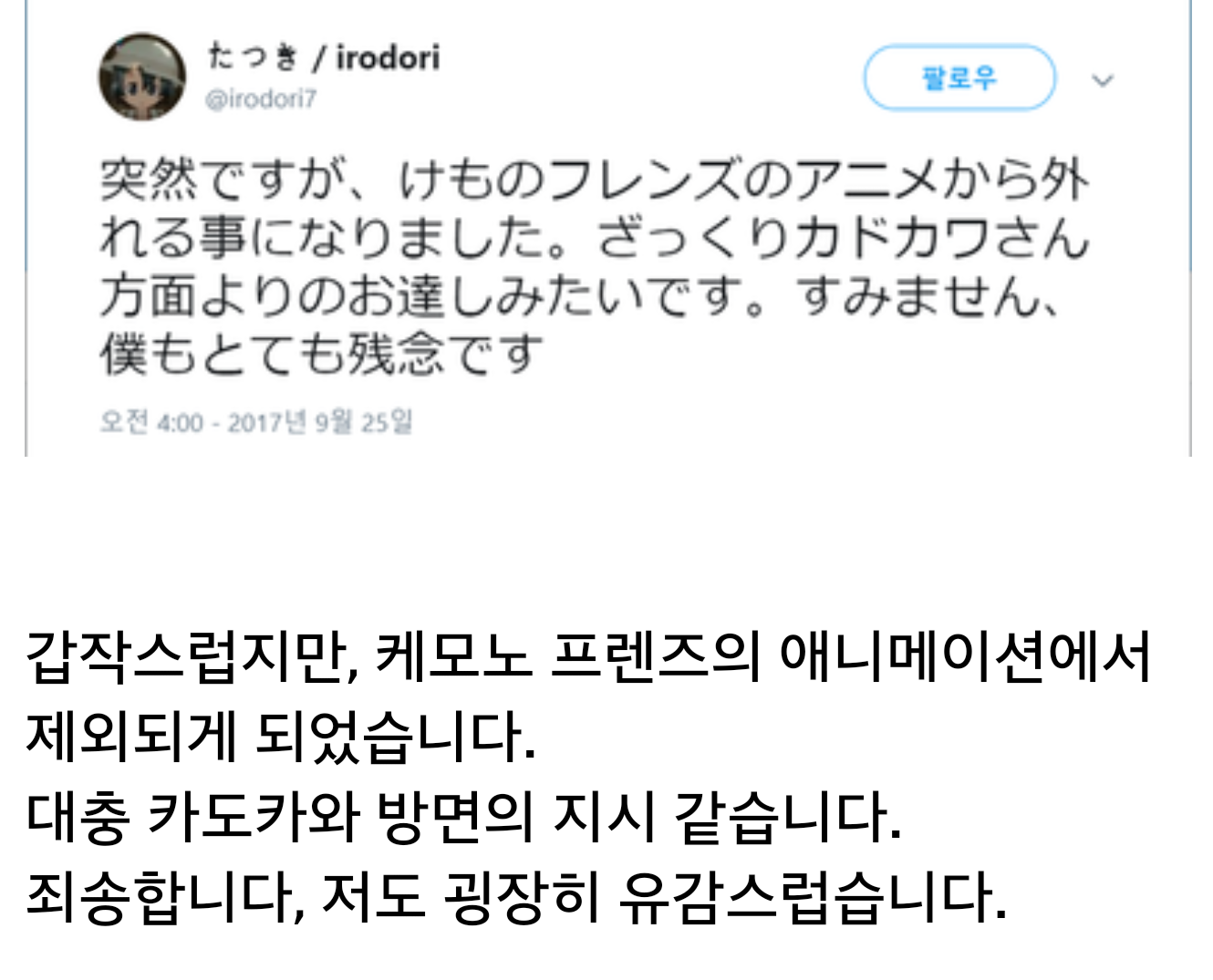Lekar 케모노 프렌즈 감독 2기 하차 [애니] 작성일시 : 2017. 09. 25 (21:30) 조회 : 2,900 / 댓글 : 0 출처(링크) : https://m.blog.naver.com/PostView.nhn?blogId=ddxzzx&logNo=221105063595&referrerCode=2&proxyReferer=http://m.me.naver.com/index.nhn 4추천 글쓰기스크랩 신고
