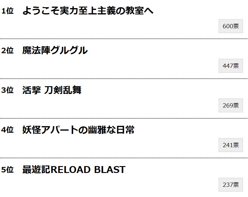 - 1위 : 어서오세요 실력 지상주의 교실에 (600표)
