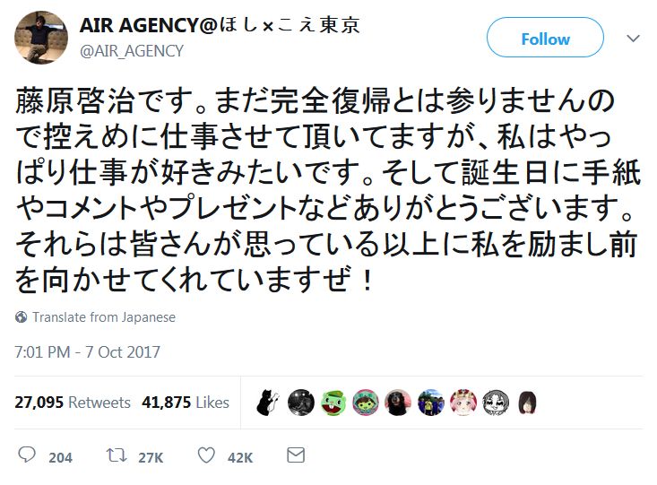 성우 후지와라 케이지씨, AIR AGENCY의 공식 트위터에서 감사 인사