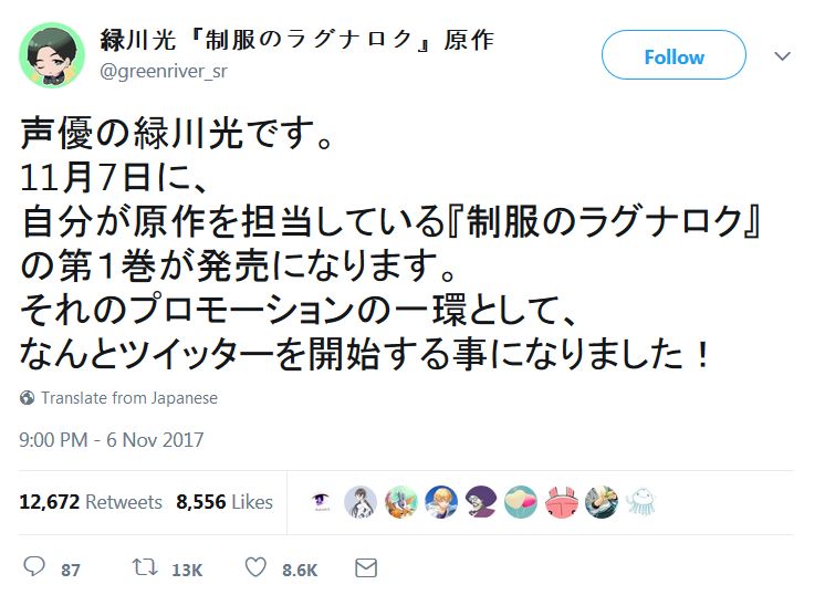 성우 미도리카와 히카루씨가 원작을 담당한 만화 홍보 트위터 개설
