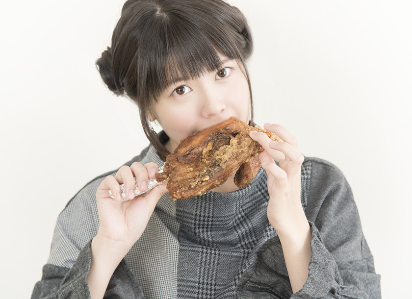 성우 타케타츠 아야나의 사진, 치킨을 뜯는 모습이 인상적이네요.