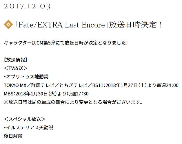 TV 애니메이션 '페이트 엑스트라 LE' 방송 일시 정보