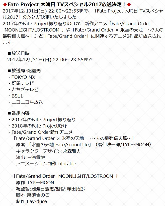 2017년 12월 31일 밤, 페이트 프로젝트 관련 TV 스페셜이 방송되는 듯