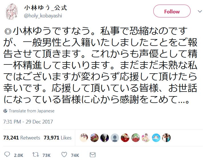 성우 고바야시 유우씨, 공식 트위터에서 일반인 남성과의 결혼을 보고